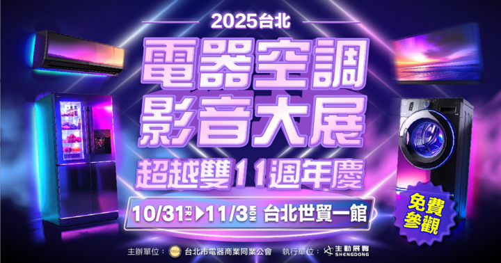 2025/10/31 10:00(+0800)史上最猛電器展!百大品牌加碼回饋、萬款家電超越雙11週年慶 2025台北電器空調影音大展以「超越雙11家電週年慶」為主題,將於10/31~11/3台北世貿一館盛大展出,匯集全球百大品牌萬款家電一站選購,更有2026年款全新AIOT新品首度開放預購,讓大家一站輕鬆體驗居家科技前衛性。Reserve Now -